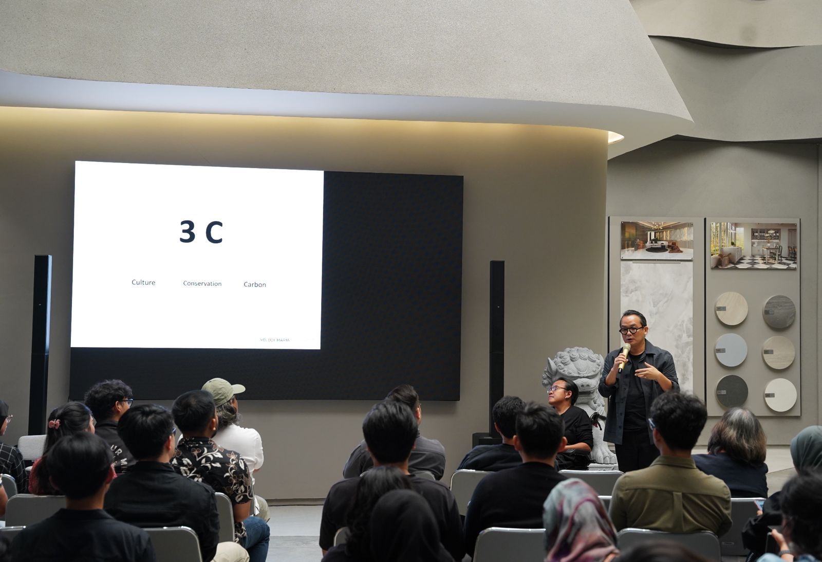 To read sustainability more contextually, Yolodi+Maria employ the 3C framework. Culture serves as the primary foundation of design, encompassing ways of living, values, and local practices. Conservation is interpreted broadly,not only in relation to heritage buildings, but also water, energy, nature, and resources. Carbon, meanwhile, is positioned as a final indicator: a consequence of design decisions rather than the sole objective.